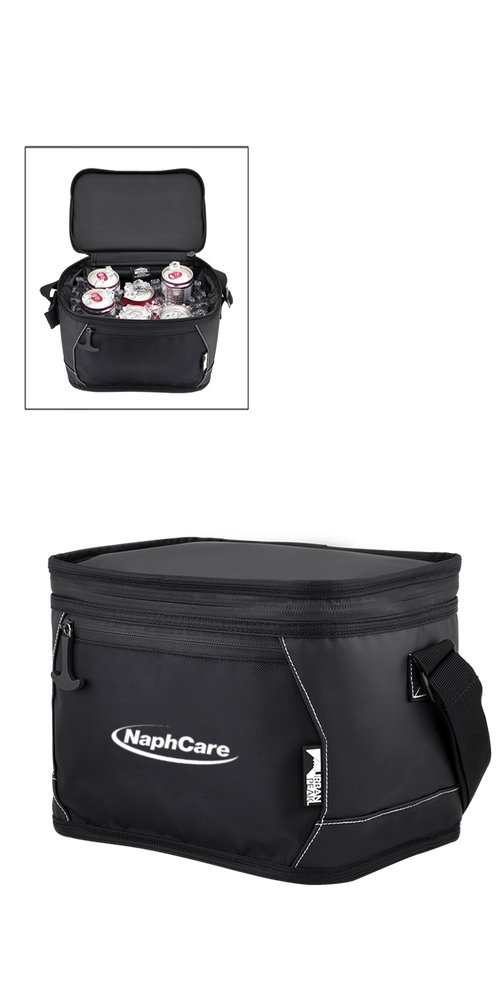 Rugged and waterproof top-loading 24 can cooler featuring thick foam insulation Constructed from 500D Tarpaulin, matte 55C PVC, 38c PVC lining, 10mm foam with 840D pocket Leak-resistant, heat-sealed liner Features a main compartment, front zippered pocket, water resistant zippers with easy grip zipper pulls and a strap-secured