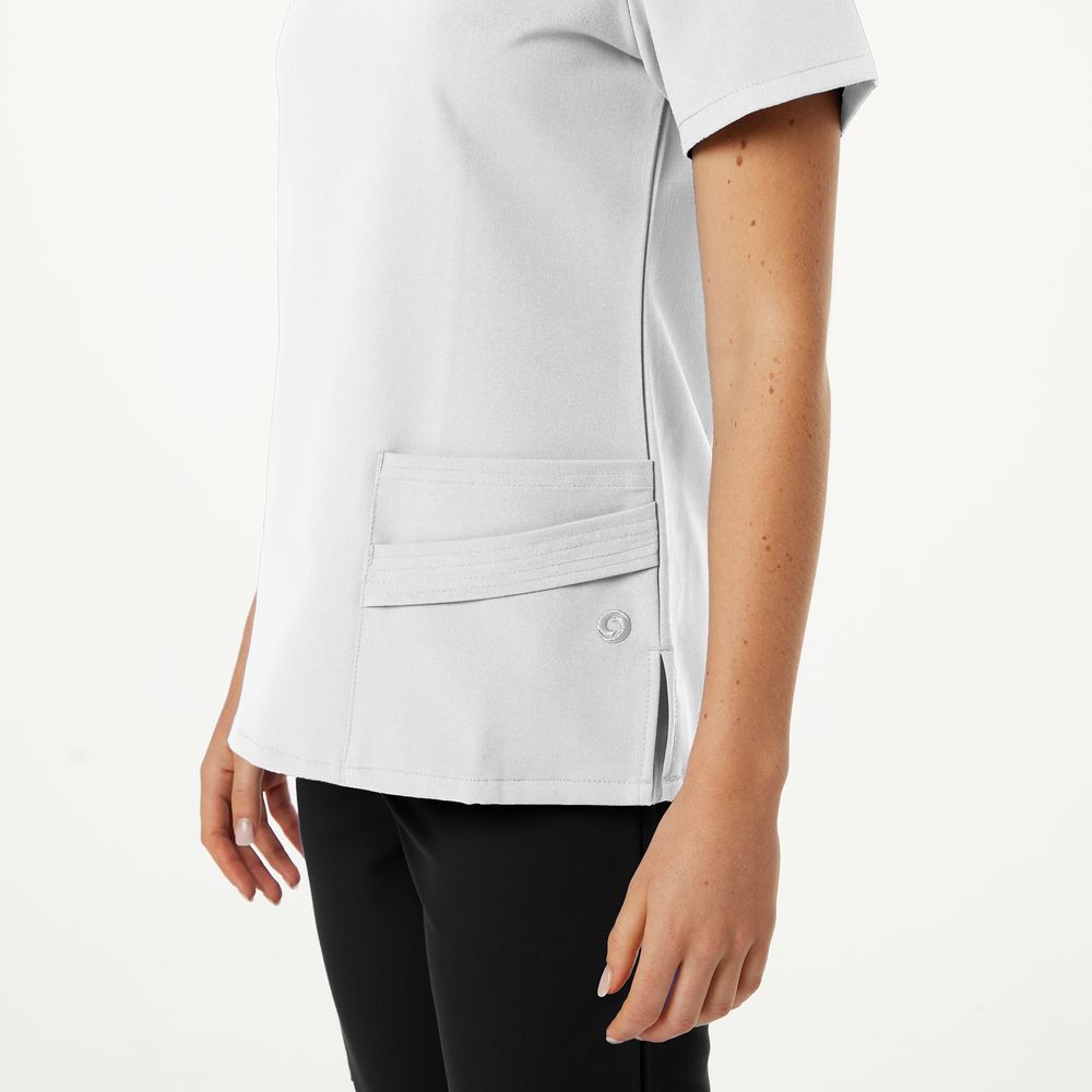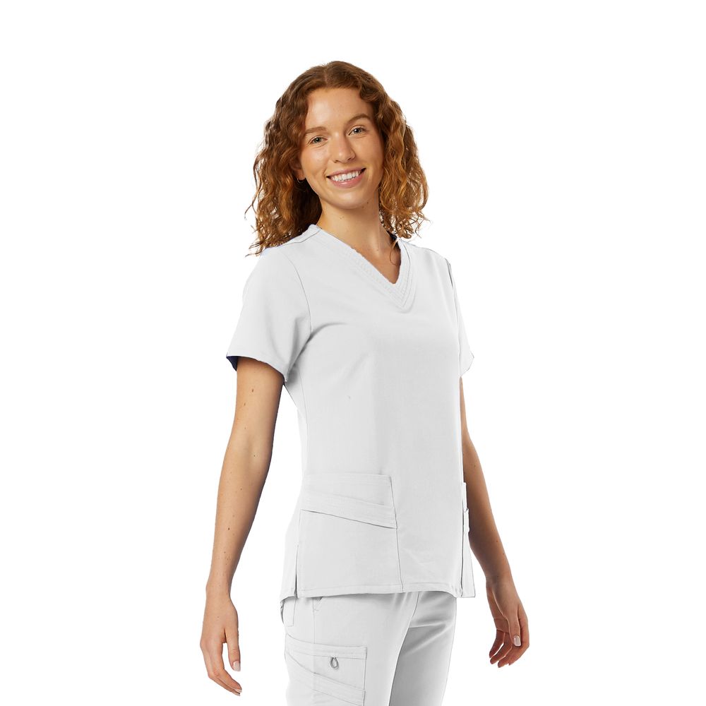 Wonderfully wearable WYND provides 4-way stretch in a fashionable and functional scrub. The Womens Multi-Pocket Scrub Top has four functional pockets and made with exceptional craftsmanship; including back princess seams for a flattering fit, double top-stitching and fabric that is sturdy, yet breathable and flexible. Spectrum's WYND line is ideal for the demands of a busy healthcare setting, yet offers a fashionable uniform option for any environment. WYND fabric boasts a patented Silvadurâ„¢antimicrobial finish, which provides odor protection, inhibits the growth of harmful pathogens and increases the lifespan and durability of the garment.